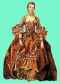 Наряд, который французы называли "robe a la frangaisе" (платье по-французски) в ту эпоху носили как открытое платье и в официальной, и в неофициальной обстановке. Облегающий лиф был открытым. Кайма украшала платье сзади по вороту, затем шла через плечи и вниз до самого подола. Пространство между краями открытого лифа заполнялось вставкой-клином, которую, в свою очередь, до самой линии талии украшали банты, уменьшавшиеся в размере сверху вниз. Такая конструкция называлась echelles. Вставка держалась на скрытых каймой петлях. Облегающие рукава доходили почти до локтя. У локтя рукава украшал широкий бант из лент. Тройная широкая кружевная оборка как бы выступала из-под рукава и доходила до середины руки между локтем и запястьем. Верхняя и нижняя юбки соответствовали типу кринолина, на который они надевались. Платье имело куполообразную форму. Поддерживавшая его исподняя юбка обычно шилась из холста, а нужную форму ей придавали с помощью обручей из лозы или китового уса. На талии она затягивалась шнурком. Нижнюю юбку отделывали оборками и фалбалами. На шею надевался кружевной плиссированный воротничок. Волосы зачесывались назад со лба и висков, а сзади поднимались и укладывались на макушке в маленький пучок. Пучок часто украшали жемчуга и ленты.