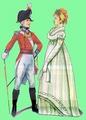 Ярко-красный мундир офицера спереди доходит только до линии талии. Высокий стоячий воротник украшен с обеих сторон навесными петлями из серебряного кружева, а спереди oткрыт, обнаруживая черный шарф и маленькое белое жабо. Мундир двубортный, отложные лацканы отвернуты на грудь, так что виден цвет подкладки. Bopот, манжеты и лацканы с лицевой стороны ярко-красные - цвет формы воинов 56-го полка. Эполеты серебряного плетения с кистями. Талия опоясана малиновым шарфом. На офицере белые кашемировые кюлоты чуть ниже колена и черные кожаные сапоги с расширенным верхом. На голове модная "двуугольная" шляпа.
